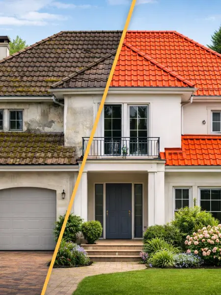Nettoyage complet de toiture et façade : élimination de la mousse, saletés et traces de pollution pour un extérieur propre et sain.